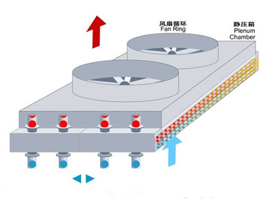 空氣冷卻器簡稱空冷器,以空氣作為冷卻劑,可用作冷卻器,也可用作冷凝器??绽淦髦饕晒苁?、支架和風(fēng)機(jī)組成??諝饫鋮s器熱流體在管內(nèi)流動,空氣在管束外吹過。由于換熱所需的通風(fēng)量很大,而風(fēng)壓不高,故多采用軸流式通風(fēng)機(jī)。